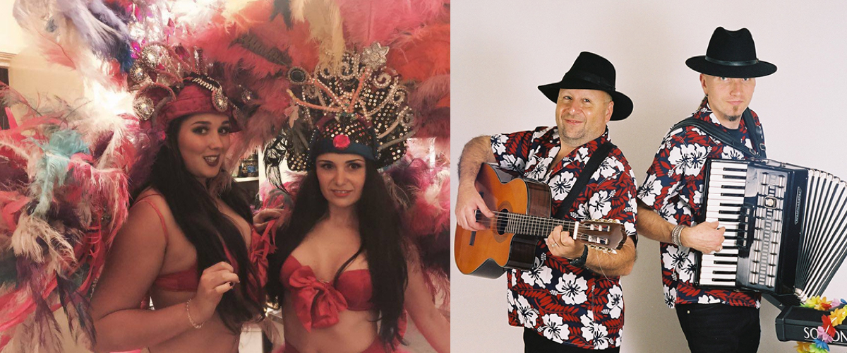 Bezetting: dans (2 mooie tropische danseressen), muziek (swingend duo) of tropische DJ naar keuze.
